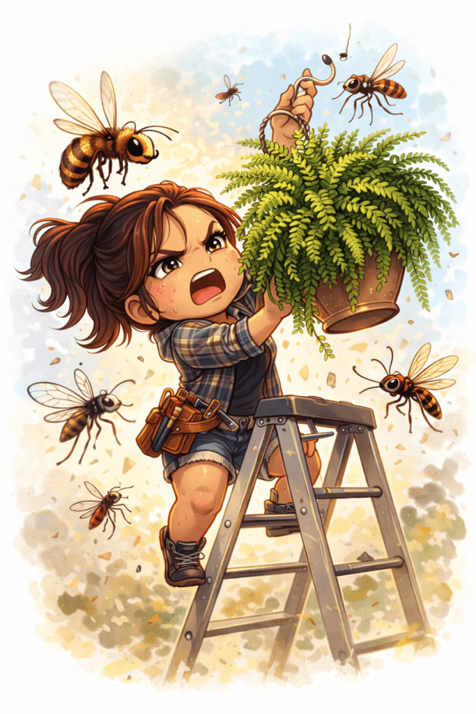 With grit, stubbornness, and what can only be described as feral determination, I completed the mission. The Boston ferns were lifted high into their rightful place, swaying triumphantly from the porch like banners after victory.